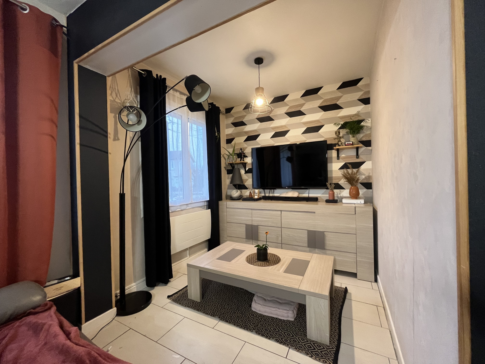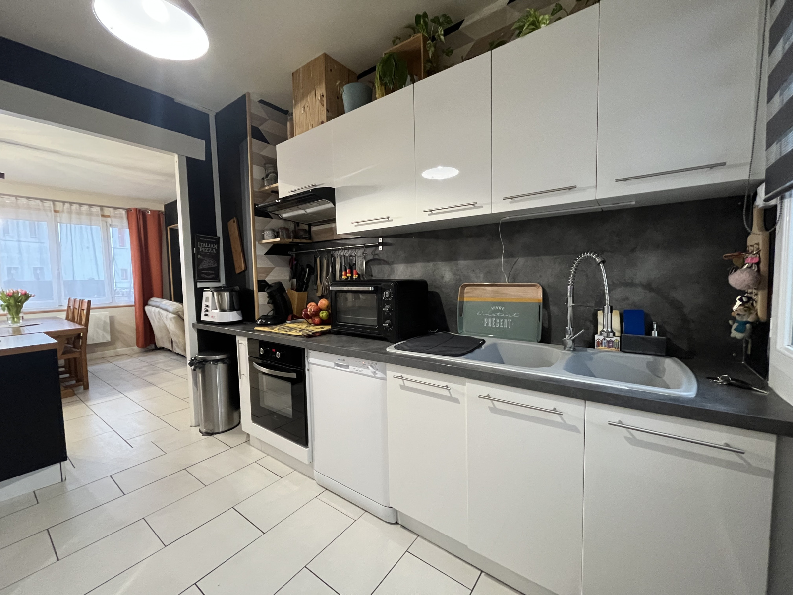 Cuisine ouverte sur salon, salle à manger, trois chambres, une salle de bain et WC.