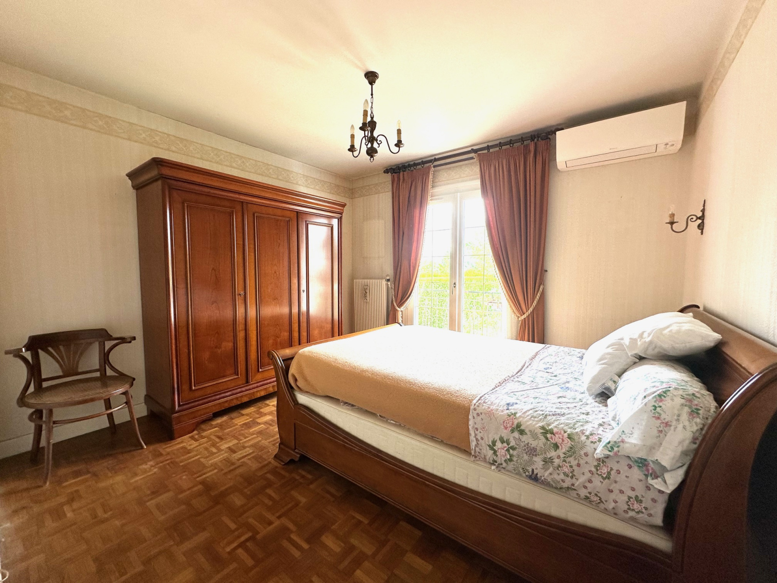 au rez-de-jardin : une entrée indépendante, un beau séjour d'environ 22m2 avec son insert bois et sa climatisation réversible, une cuisine aménagée et équipée, 3 belles chambres (dont une climatisée), une salle d'eau avec placards et wc séparés.