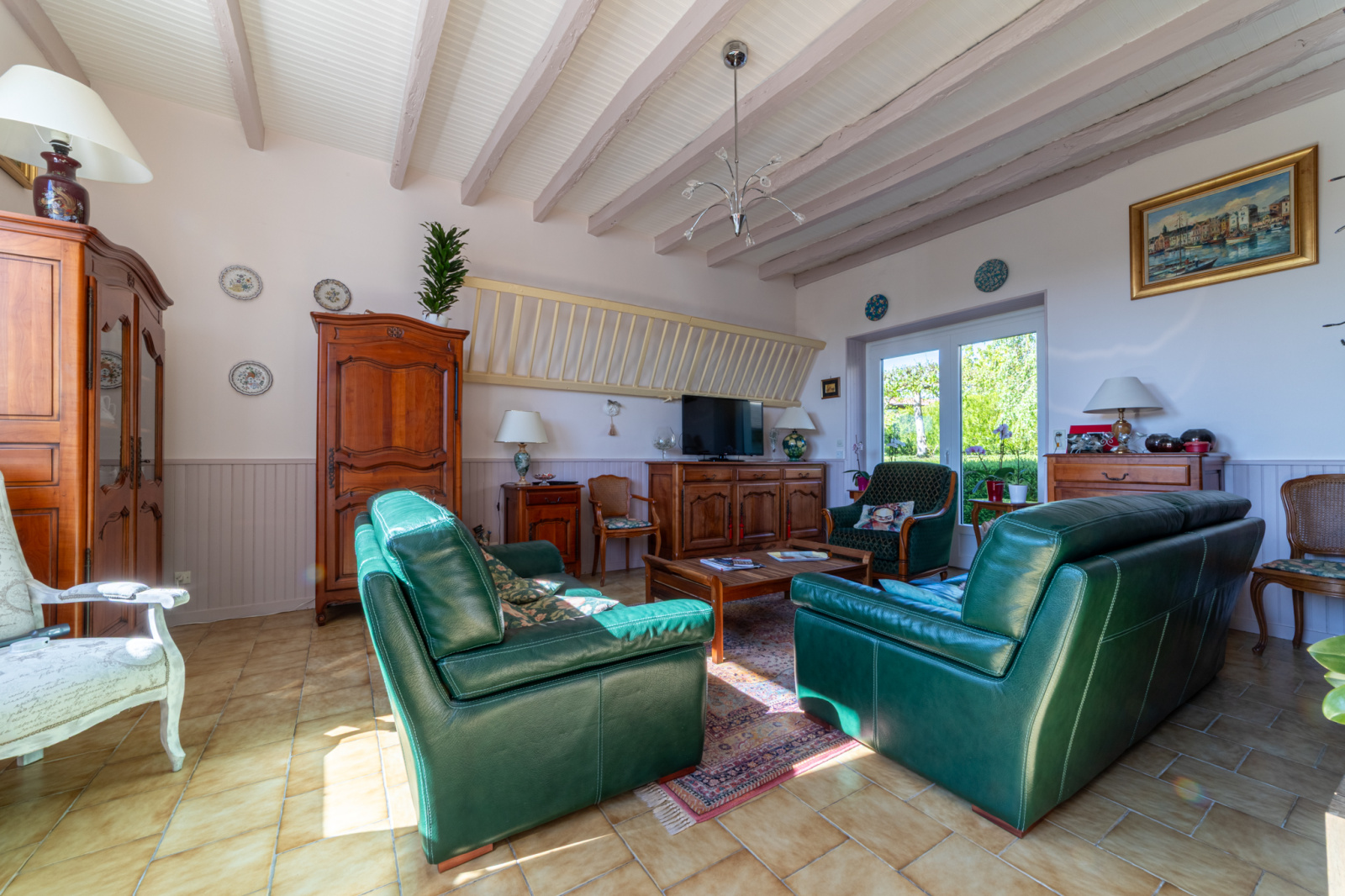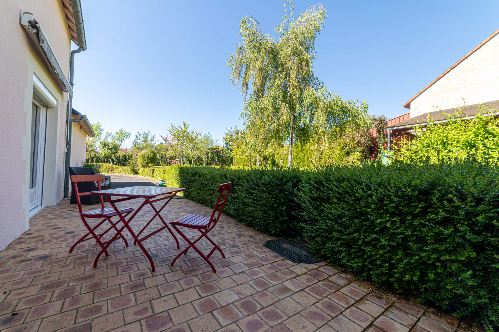 Cette maison lumineuse  offre un cadre extérieur de verdure tout autour avec une terrasse et un appentis.