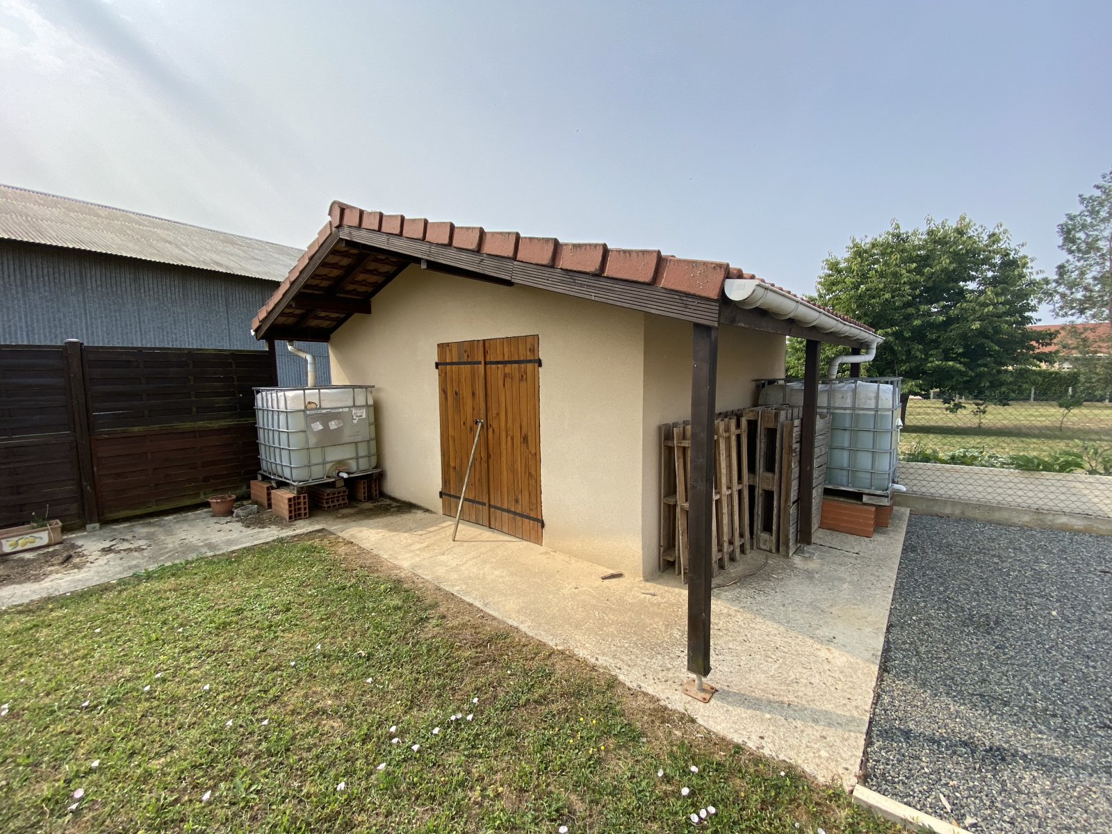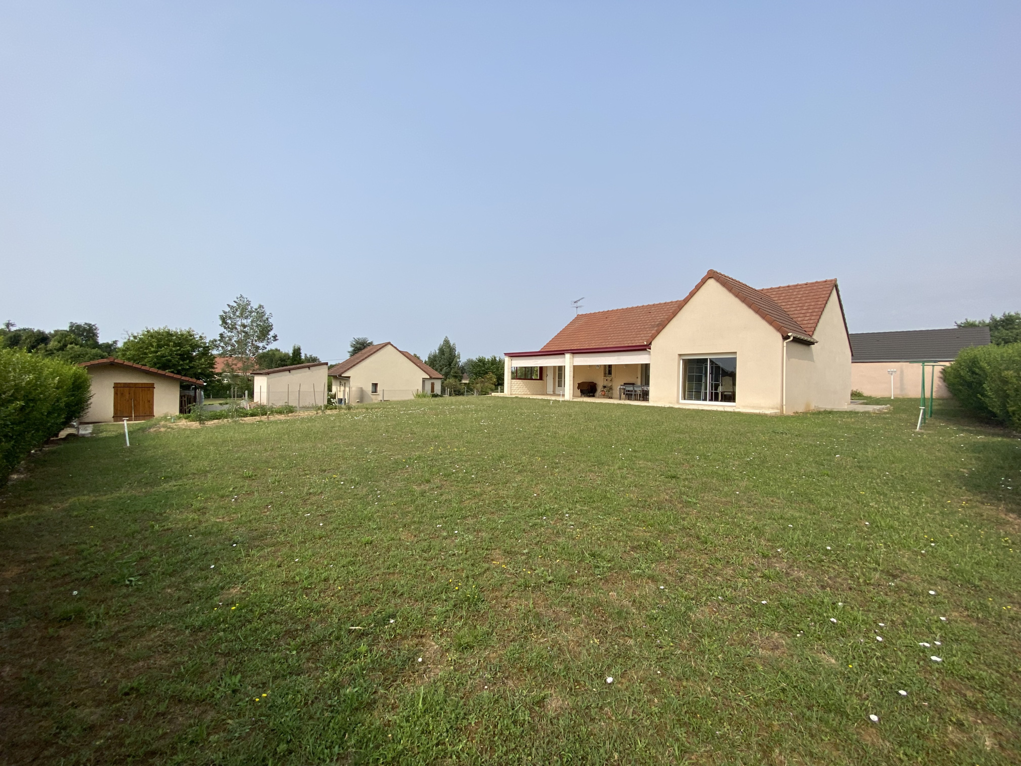 Terrain clos de 1569m2 avec terrasse et cabane de jardin.
