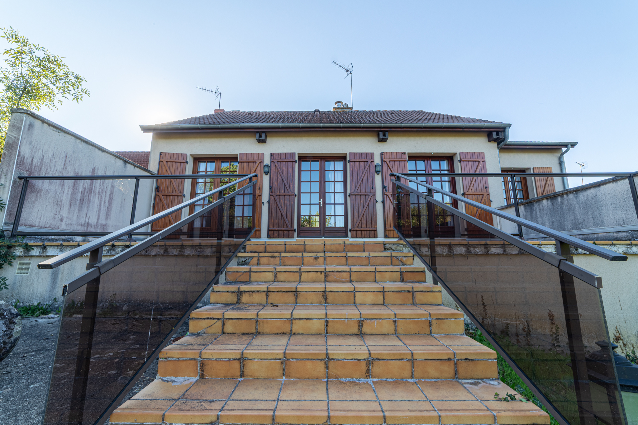 Accessible depuis la cuisine, un balcon filant donnant sur l'avant de la maison. Sur l'arrière, une grande terrasse carrelée donnant sur un beau jardin avec de nombreux arbres fruitiers.
